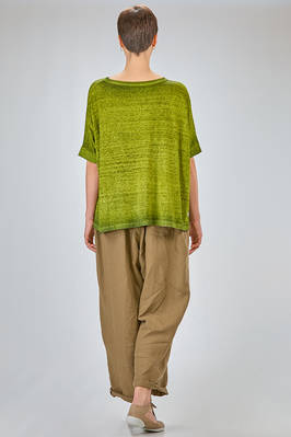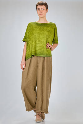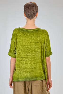 t-shirt al fianco, ampia, in maglia fiammata e tutta sfumata di lino sovra-tinto, ampio girocollo, manica corta scesa. La modella è alta cm. 180 e indossa la taglia M