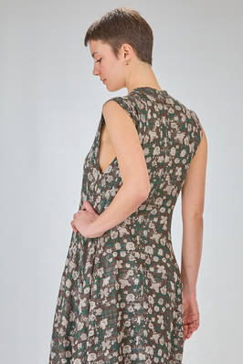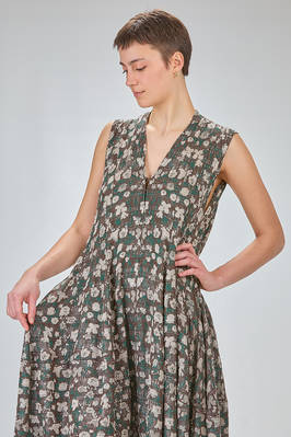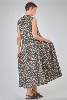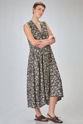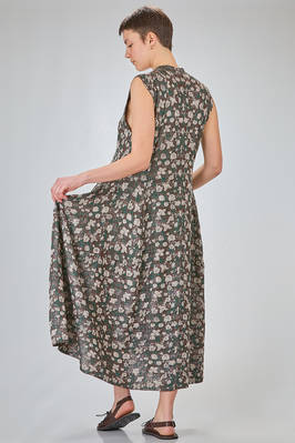 abito lungo e sfiancato in maglia di cotone, seta e lino con fiori 'stramati' in contrasto di colore, profondo scollo a v con bottoncini, senza maniche, tasche a filo verticali ai lati, fondo ampio a onde. La modella è alta cm. 180 e indossa la taglia M