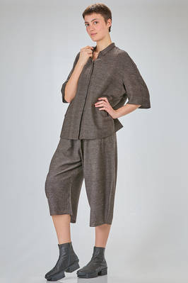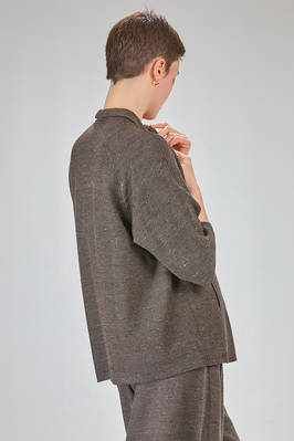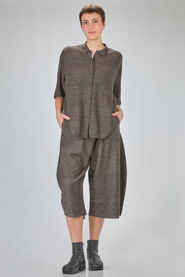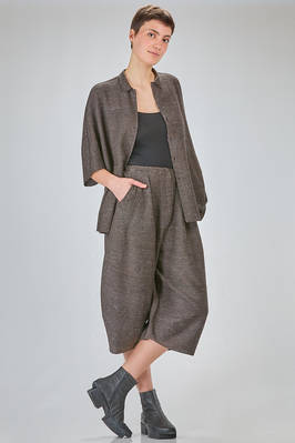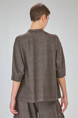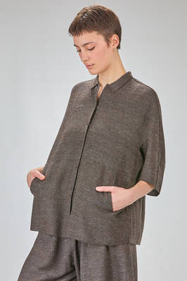 camicia lunga e ampia in maglia ad effetto shantung di seta e cotone melange, collo a camicia, chiusura con bottoni a scomparsa sul davanti, manica corta scesa, tasche a filo verticali ai lati, molto bella portata anche a giacca. La modella è alta cm. 180 e indossa una taglia M