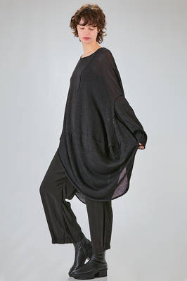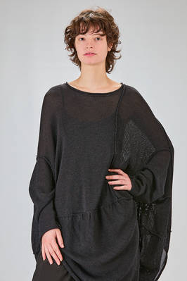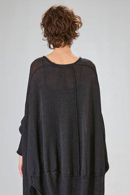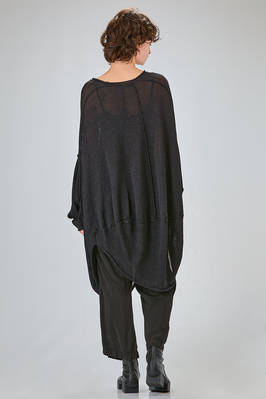 tunica lunga, ampia e asimmetrica in maglia di cotone, lino e carta tessile, ampio girocollo, manica lunga scesa, fondo stondato più lungo da un lato, cuciture esterne, spacco laterale sul davanti. La modella è alta cm 170 e indossa la taglia S