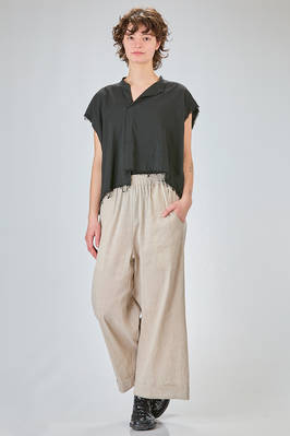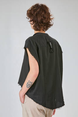 camicia corta, ampia e asimmetrica in mussola di cotone lavato con profili a taglio vivo, collo a fascetta con apertura a v, fondo asimmetrico più corto da un lato e stondato sul retro. La modella è alta cm. 170 ed indossa una taglia I