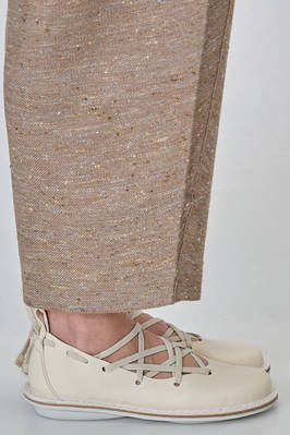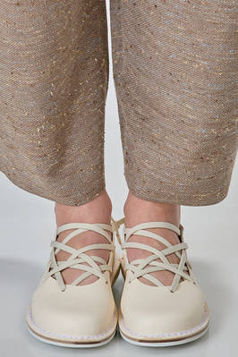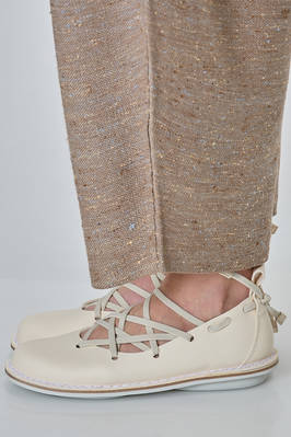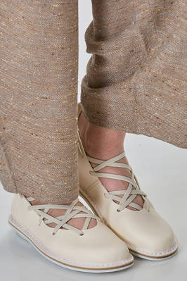 scarpa a pianella in pelle di vacchetta con fettuccia elastica intrecciata e regolabile – si allaccia sul retro – che scorre e disegna il profondo décolleté, soletta interna in sughero removibile, suola arrotondata in gomma